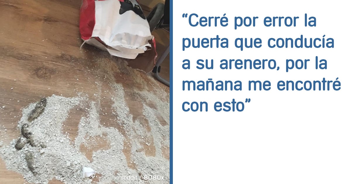 «Mi gato no pudo llegar a su caja de arena porque se me olvidó dejar la puerta del baño abierta durante la noche, por lo que derramó su bolsa de arena y…»