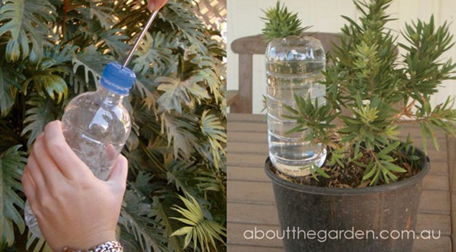 Atraviesa el tapón de una botella de plástico o corcho y haz un pequeño agujero. Después entierra el cuello de esta en una maceta, así se regará sola cuando te vayas de vacaciones.