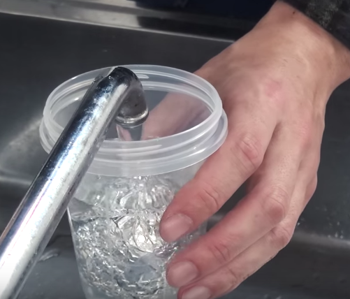 Llena el vaso de agua y mételo en el microondas durante 15 minutos a 500W. IMPORTANTE: El agua debe cubrir todo el aluminio tal como en la foto de abajo.