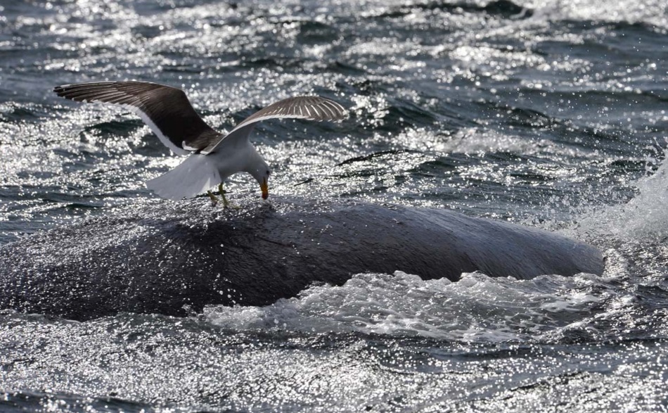 Sin embargo, la gaviota cocinera ha ideado una macabra forma de alimentarse de las ballenas francas con las que cohabitan en la costa argentina. Desde hace unos años se ha observado que las aves se lanzan sobre las espaldas de las gigantescas ballenas para picotear su lomo y arrancar su carne, dejándoles heridas abiertas de hasta 20 centímetros de largo.