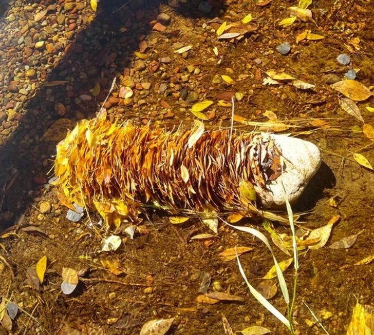 Algunas hojas atrapadas en una roca en un arroyo.
