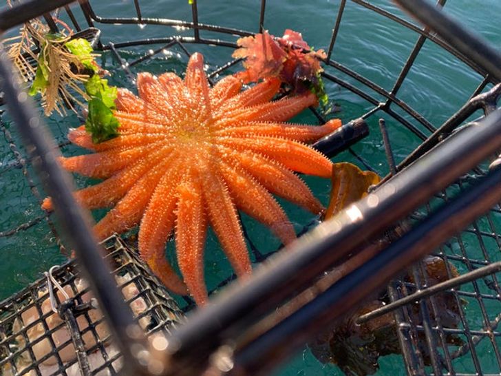 Una hermosa estrella de mar girasol en peligro de extinción quedó atrapada en nuestra trampa para cangrejos (Orcas Island, WA).