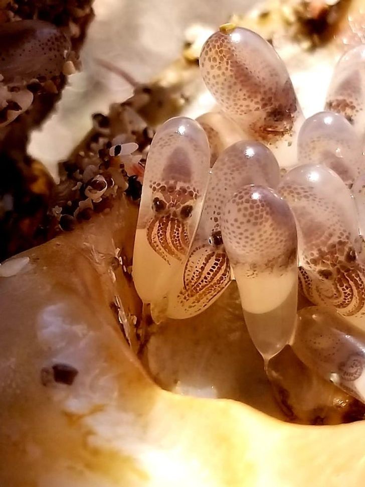 Mi sobrino encontró una concha de mar con huevos de calamar adentro.