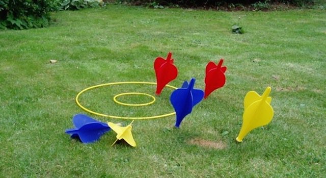 Aprovechando la ley de la gravedad, alguien decidió crear una diana con dardos gigantes de punta afilada que debían ser lanzados al aire.