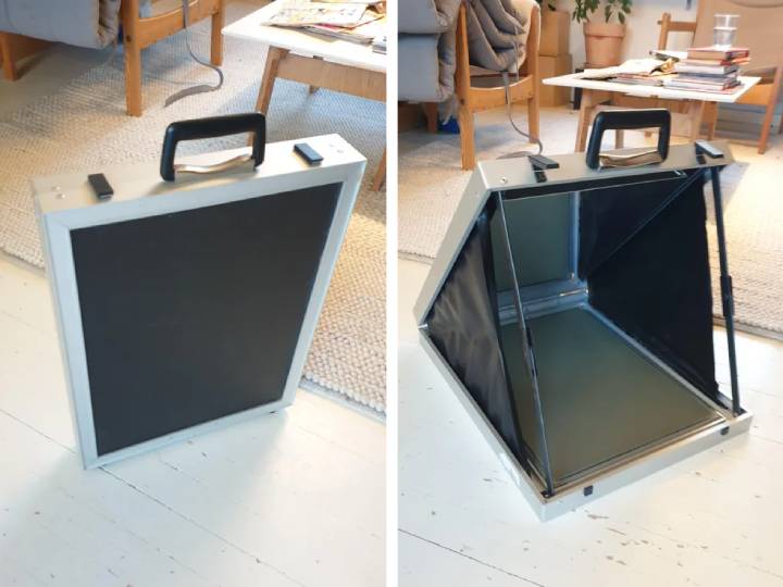 Es una pantalla de proyección. Se debe apuntar el proyector hacia el espejo, donde rebotará la imagen y se reflejará en el exterior.