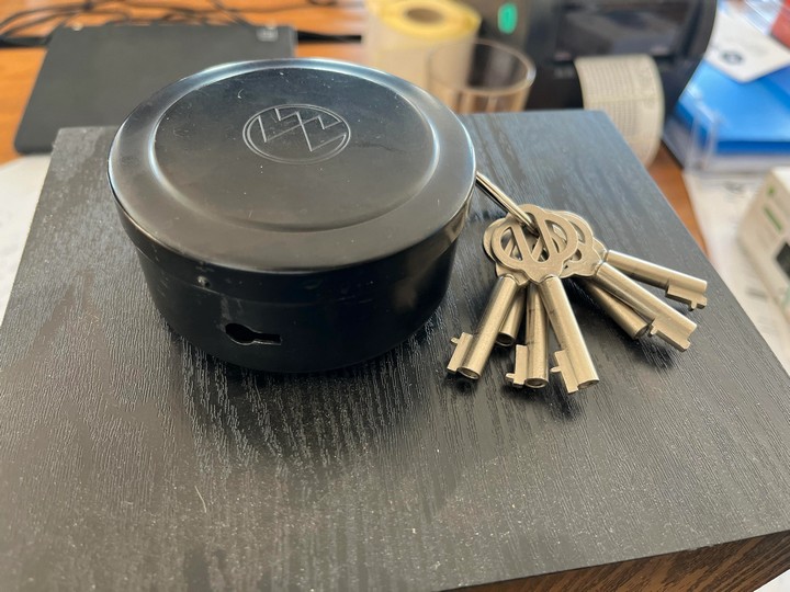 Era el reloj de los vigilantes. Al interior de la caja hay una cinta que registra el tiempo. Las llaves debían estar distribuidas por toda la instalación para que el vigilante tomara una llave, la ingresara a la caja y marcara en la cinta la hora.