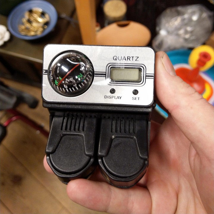 Se trata de una brújula para autos, muy utilizada en la década de los 80. Las partes con resortes eran monederos que facilitaban el pago de peajes.