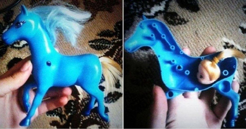 7. Una cabeza de muñeca dentro de un caballo de juguete.