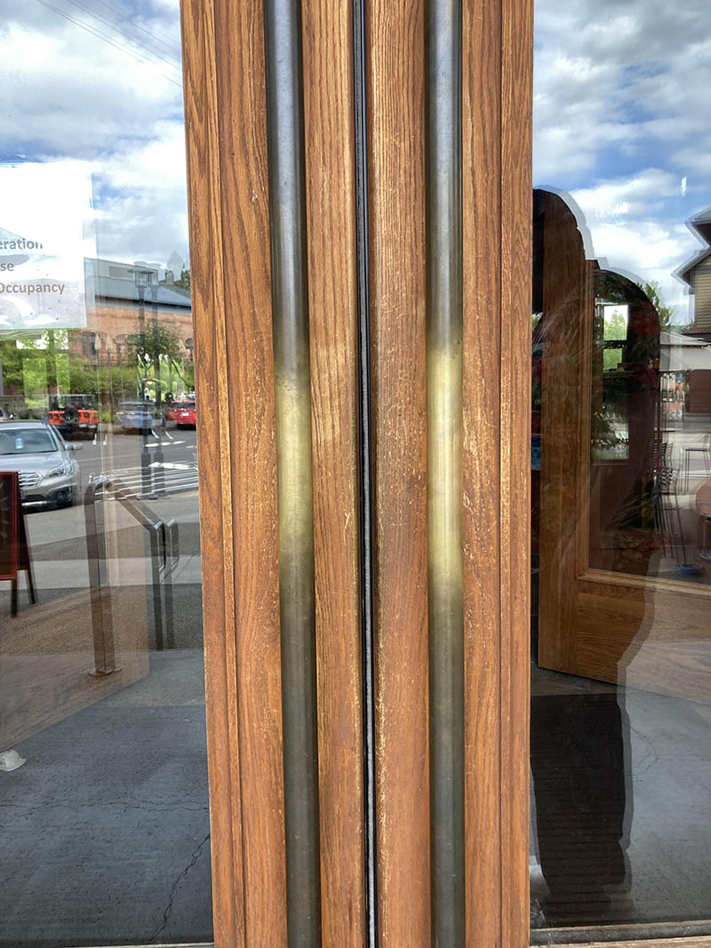 12-. El pomo de esta puerta es de un restaurante local. Se puede ver cuál es el lado predominante para entrar.