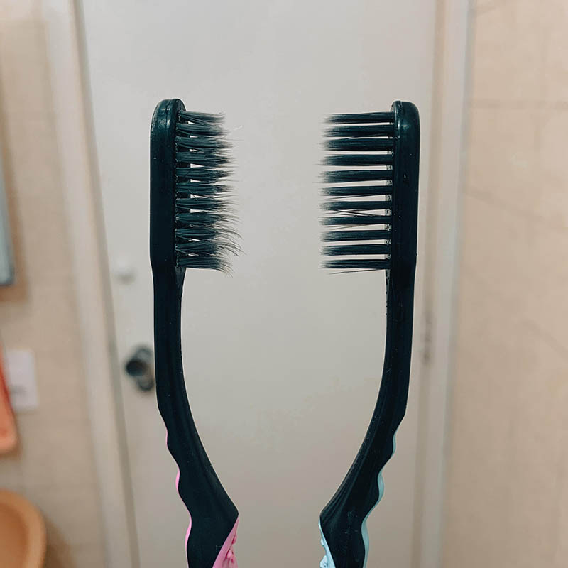 2-. Un cepillo de dientes que fue usado por todo un año y el cepillo que está en su primer día de trabajo.