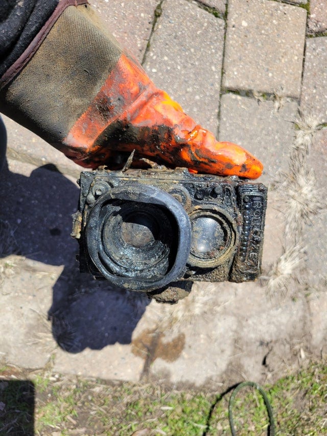 Así que saqué esta caja fuerte del canal. Pensé que yacía allí por un montón de años. Dentro encontré lo que había en la foto, además de varias baterías, fotos de pasaporte y una libreta de ahorros del banco.