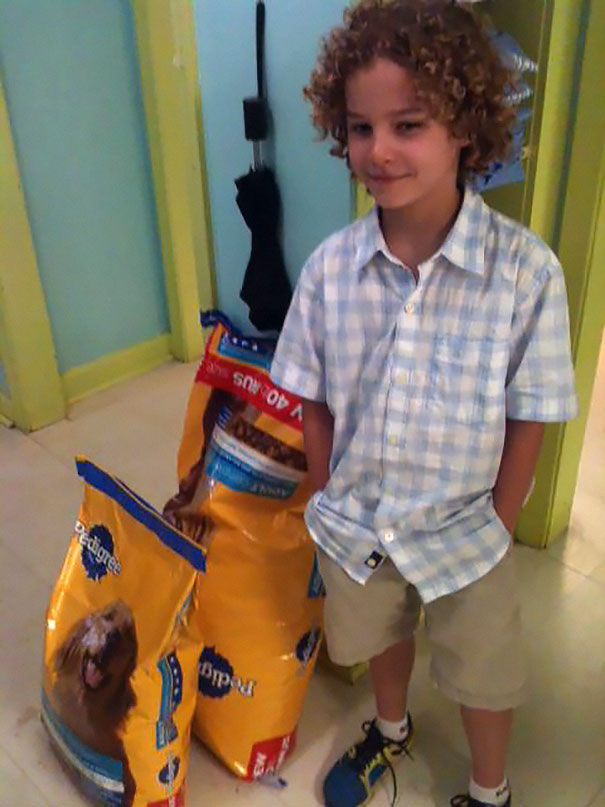 Este pequeño hombrecito compró comida de perro con su propio dinero para donarla al refugio de animales.