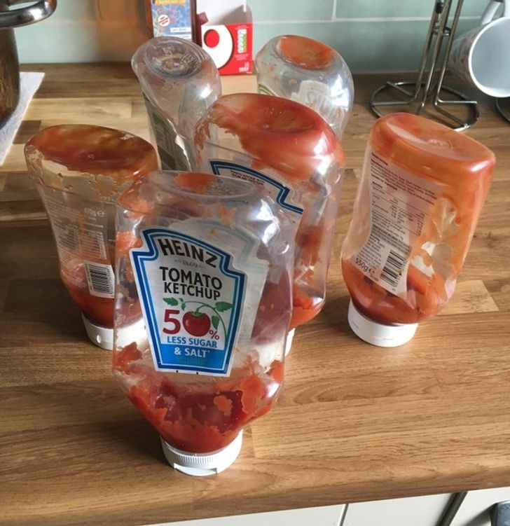 13. Parece que alguien colecciona botellas de ketchup a punto de terminar