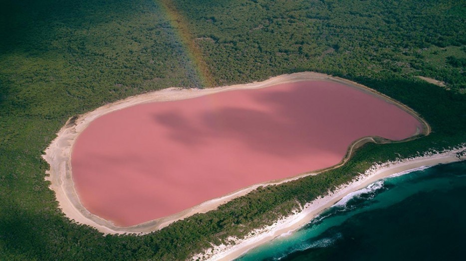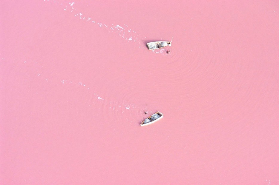 Se piensa que el color rosa de este lago es el resultado de un colorante creado por algas y bacterias en el agua.