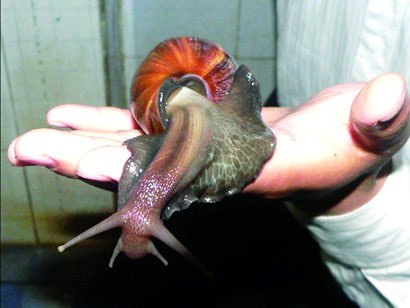 El Achatina fulica es la mayor especie de caracol que existe. Alcanza unos increíbles 25 centímetros de longitud y 200 gr de peso.
