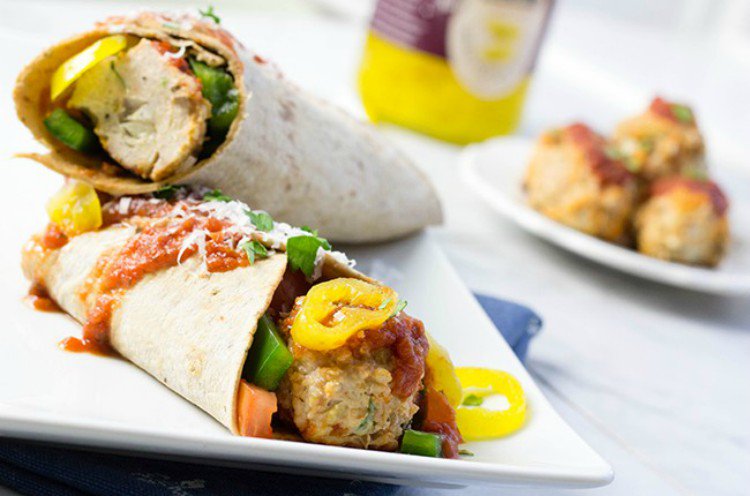 4. Extiende un par de cucharadas de tomate o salsa marinara en las tortillas, coloca al albóndigas y añade pimiento, tomate y chile al gusto. Disfruta.