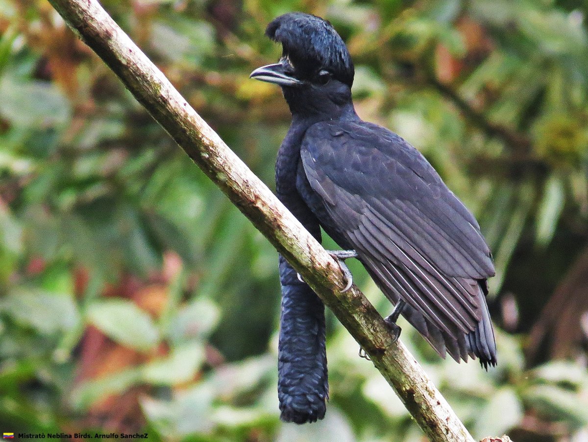 Esta ave habita en los bosques de Colombia y Ecuador, mide 40 cm, tiene un penacho y un péndulo de plumas que le cuelga del cuello a manera de corbata; ésto puede llegar a medir hasta 35 cm de largo y sirve para atraer a las hembras. Es muy lento para volar y por eso prefiere saltar entre las ramas.