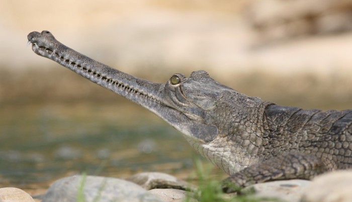 Es un cocodrilo asiático que se caracteriza por tener una boca muy larga y delgada, le sirve para alimentarse de peces e insectos. El animal puede llegar a medir seis metros de largo; lamentablemente se encuentra en peligro de extinción debido a la destrucción de su hábitat y su caza para la utilización de su piel.