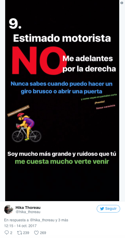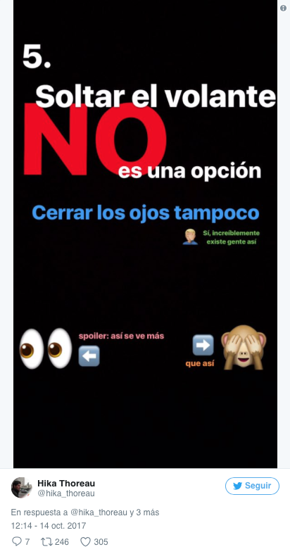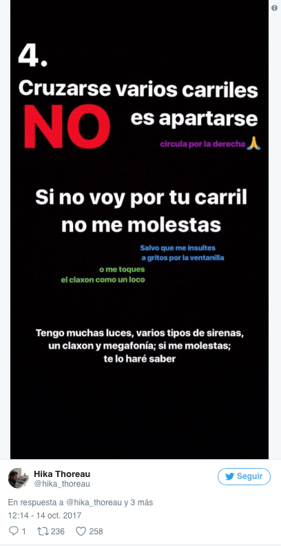 En sus tuits, el enfermero pide a los conductores que, ante todo no frenen, que (si pueden) se aparten a la derecha, que usen los intermitentes y retrovisores, que no se paren en una curva ni crucen varios carriles y, por supuesto, que utilicen su sentido común: