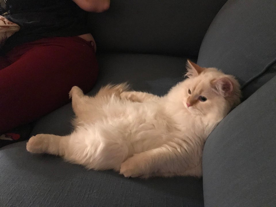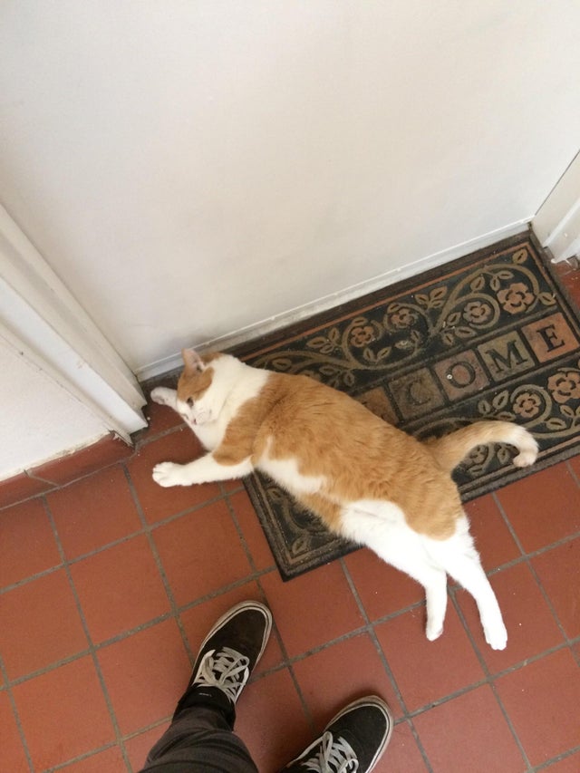 «Mi gato se pone un poco ansioso cuando se queda solo en casa y maúlla ruidosamente. El gato que vive abajo suele deambular por los pasillos varias veces en semana. Un día, llegué a casa del trabajo y encontré al vecino felino acostado frente a mi puerta, en lo que parecía un intento de consolar a mi gato»