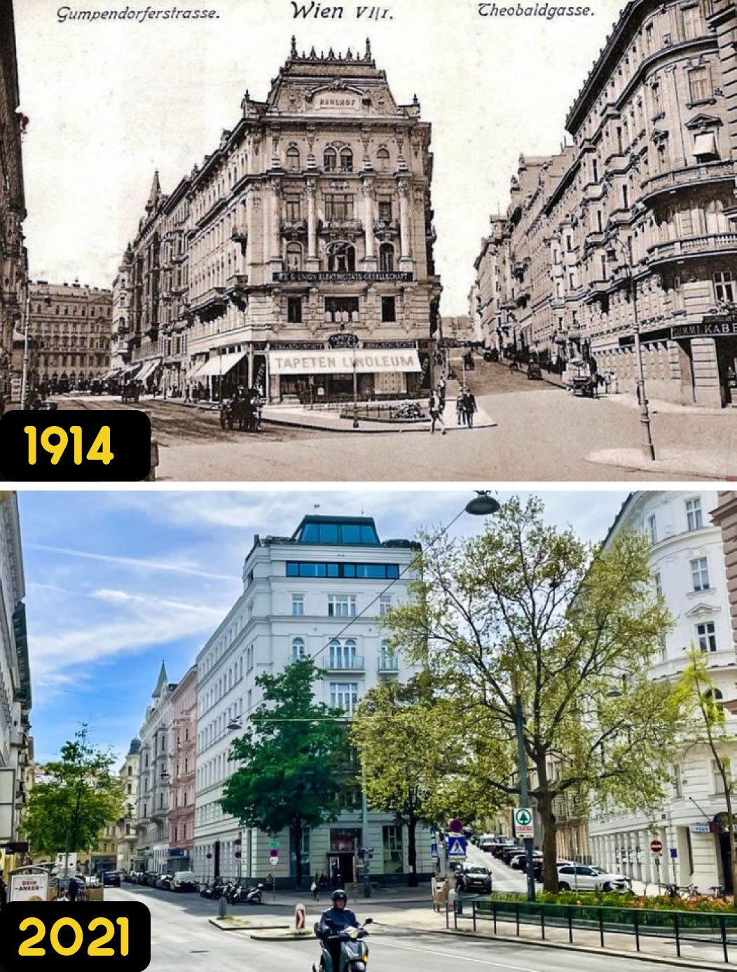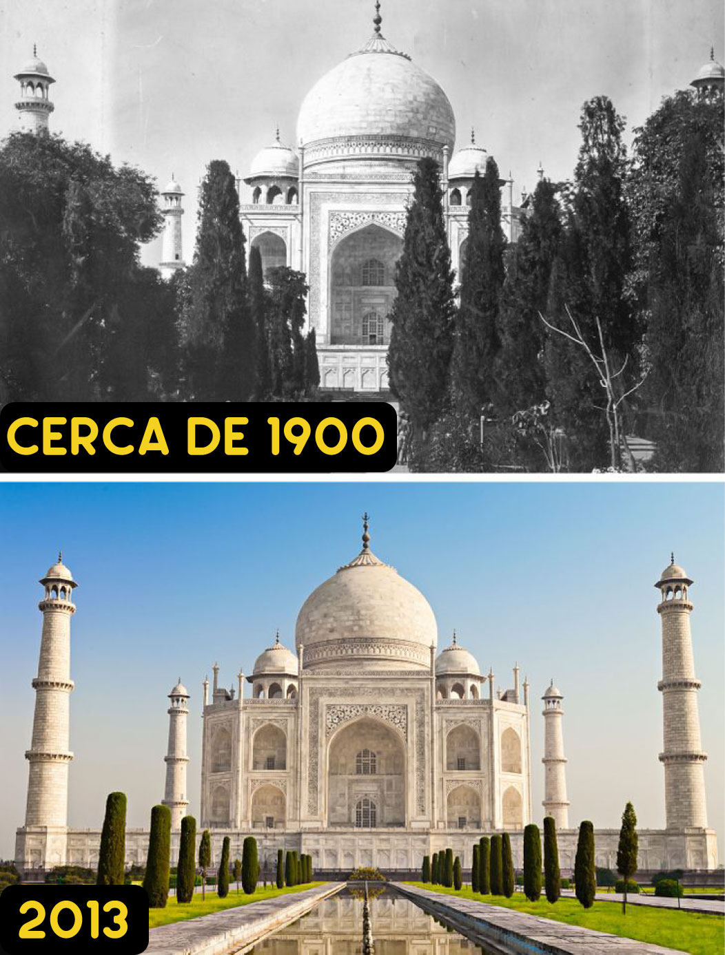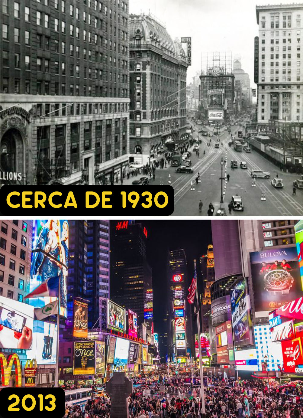 La siguiente galería muestra con mayor claridad el antes y después que nos transportan al pasado pero que también nos trae de vuelta al presente para observar cuánto han cambiado las cosas. Desde la inmensas calles de Nueva York a inicios del siglo XX hasta un paseo tranquilo en las inmediaciones de la Torre Eiffel, todo esos ya notables cambios son resultado de nuestra historia.
