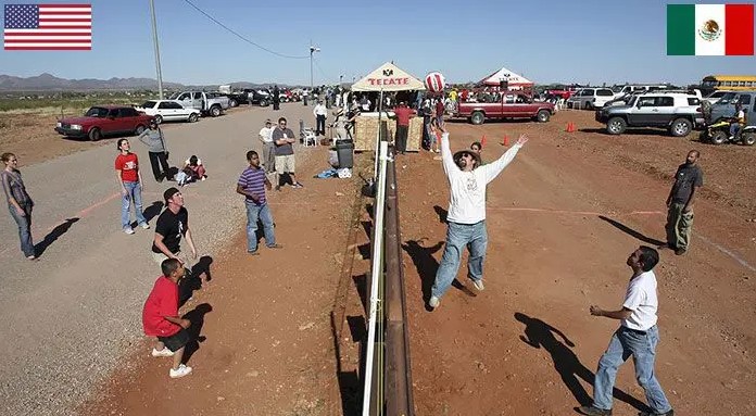 24. Los residentes de Naco, Arizona se unen a los residentes de Naco, México para un partido de voleibol durante la cuarta «Fiesta Bi-Nacional» en la cerca que separa los EE. UU. (izquierda) y México (derecha), el 14 de abril de 2007