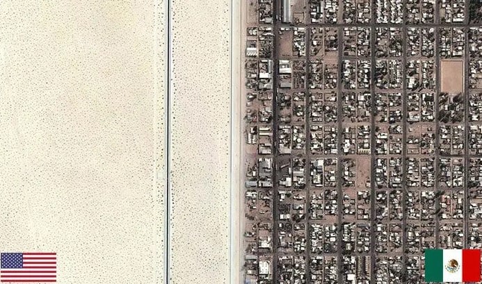 12. Vista aérea de una zona desértica al sur de Yuma, Arizona (izquierda) y, al otro lado de la valla fronteriza, las calles de San Luis Río Colorado, Sonora, México