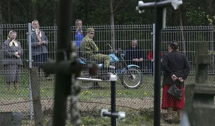 8. La mujer de la derecha está de pie en la aldea lituana de Norviliskes para hablar con sus parientes bielorrusos al otro lado de la frontera entre Bielorrusia y Lituania.