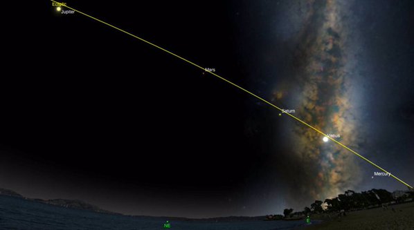 La alineación completa solo podrá ser disfrutada al amanecer, entre las 5 y las 6 de la mañana, ya que los planetas aparecen a distintas horas.