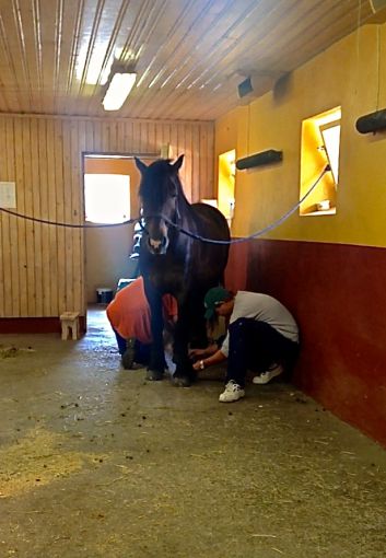 Dos reclusos atienden a uno de los caballos de la prisión que ayudan a realizar las tareas diarias de la isla.