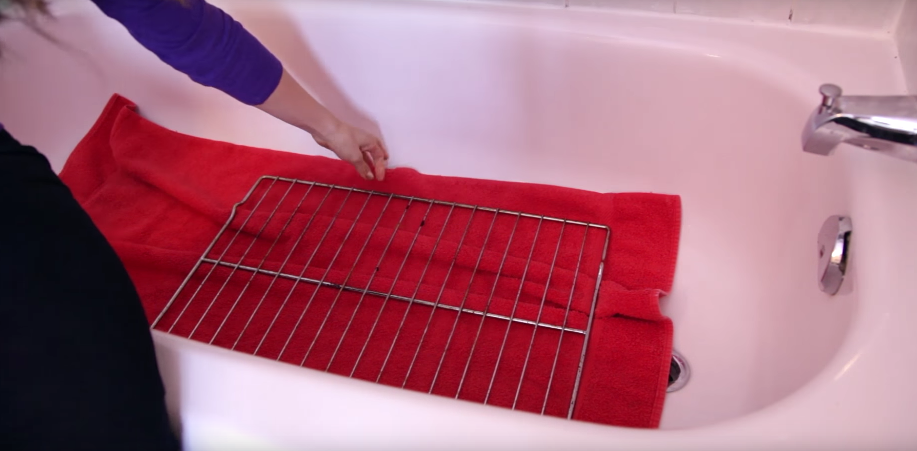 En primer lugar colocaremos la toalla vieja en el fondo de nuestra bañera, o plato de ducha, evitando así que la loza y la porcelana se dañen y se rocen.