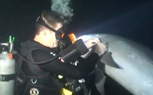 Delfín pide ayuda a unos buceadores para que lo liberen de una red