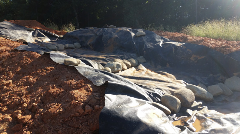 Tras un mes de espera, la tela impermeable llegó y pudo ser colocada sobre el terreno
