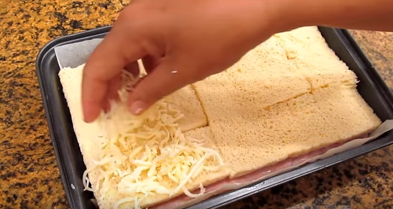 Ponemos la mitad de las rebanadas de pan como base, cortando algunas para rellenar los huecos