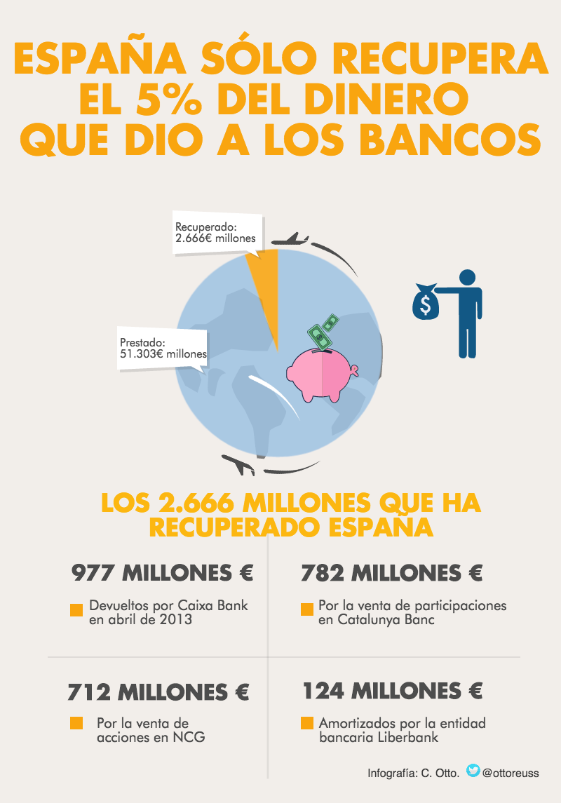 A fecha de mayo de 2015, España sólo ha recuperado 2.666 millones de euros, un porcentaje claramente irrisorio si tenemos en cuenta que el rescate bancario a lo largo de todos estos años ha supuesto la inyección de 51.303 millones de euros que salieron de las arcas del Estado.