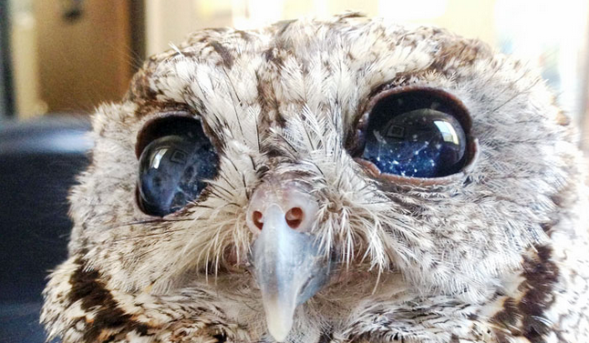 Hace unas semanas en el sur de California, alguien encontró un búho herido en su porche. Resultó ser una pequeña lechuza ciega. Sus ojos eran de un azul profundo y oscuro, salpicado de fibras y puntos blancos que parecen reflejar una noche estrellada.