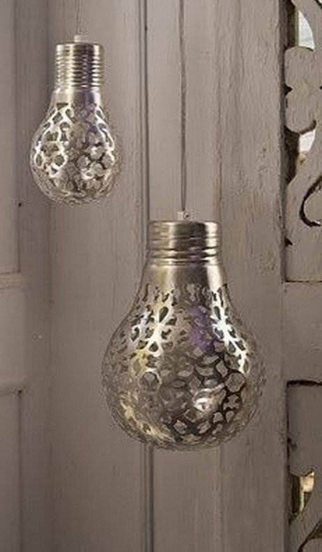 Estas bombillas han sido cubiertas con un tapete viejo y después pintadas. Una vez encendidas el juego de luces es impresionante. Puedes crear tú mismo los diseños que quieras, pero asegúrate de que la pintura sea resistente al calor