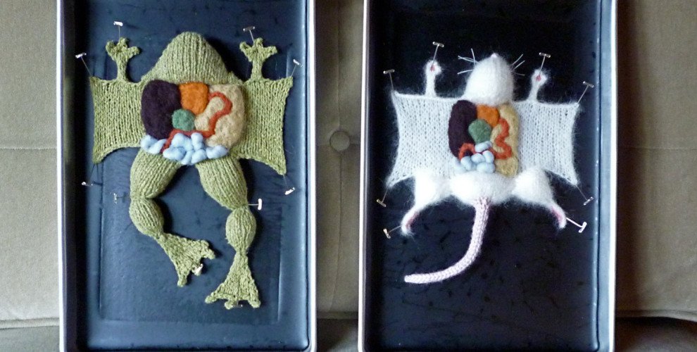 Emily Stoneking, es la artista que ha puesto a la venta esta curiosa colección de falsos animales disecados realizados con lana tejida a mano, una colección que ella llama en inglés aKNITomy. Su divertida colección de punto incluye ranas, ratones e incluso una lombriz de tierra. Otras muestras menos habituales son un cerebro, una neurona, un murciélago y cabeza humana.
