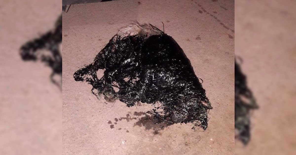 Sin embargo, el perro seguía vivo. De primeras, sus rescatadores pensaron que alguien le había lanzado alquitrán, pero lo más probable es que se hubiera caído a alguna zona de carretera recién pavimentada con alquitrán caliente