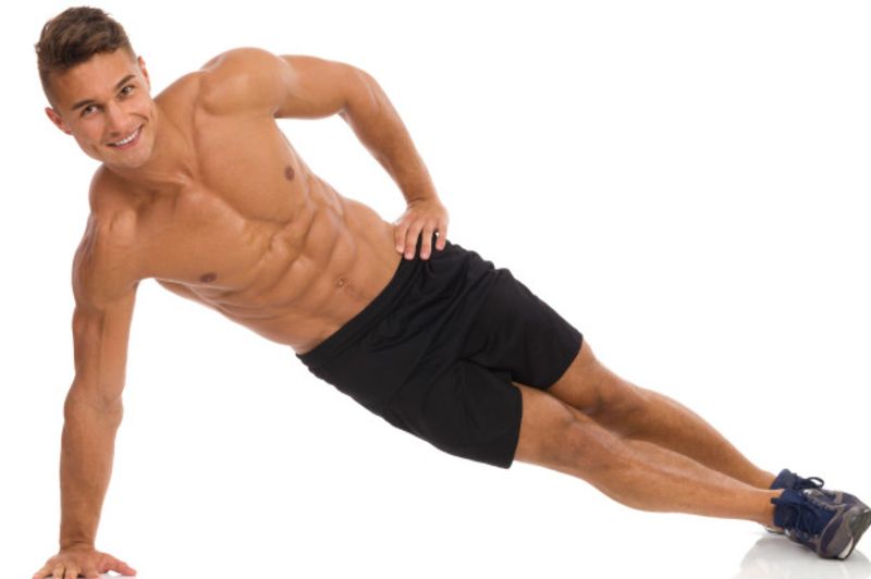 Para la plancha lateral tienes que apoyar todo tu peso sobre un brazo y los pies, tal y como puedes ver en la fotografía durante 30 segundos. Después cambia de brazo.