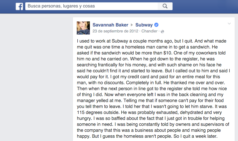 «Hace un par de meses que trabaja como cajera en un Subway, pero renuncié. Lo que me llevó a renunciar fue que una persona sin hogar entró en el local para comprar un sandwich.