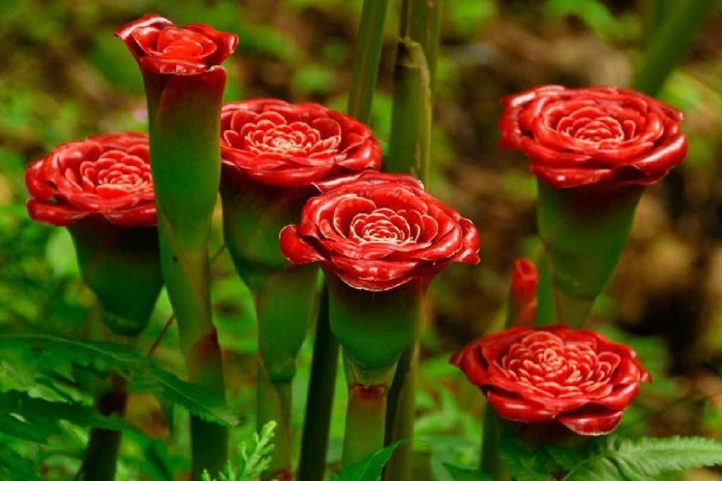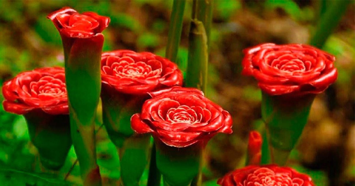 Este es el aspecto externo de la planta y flor del jengibre o quion, siendo su tallo subterráneo la parte comestible.
