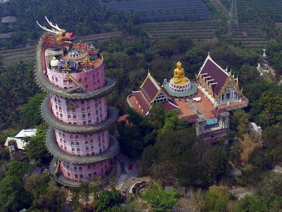 El templo Wat Samphran está ubicado a 40 kilómetros de Bangkok y su principal característica es que un enorme dragón rodea a uno de sus edificios, una torre roja de 17 pisos. A pesar de que es un templo muy llamativo, no es muy frecuentado por los turistas porque no aparece en las guías de viajes.