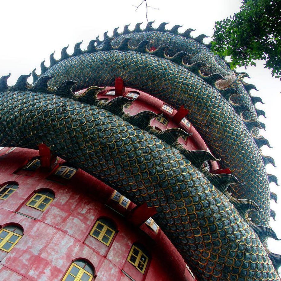 Curiosamente, el dragón que rodea a la torre sirve como escalera para acceder a los pisos superiores del edificio, y poder ver una representación del nacimiento de Buda. Además, en la terraza de la torre se puede tocar la barbilla de la criatura, y pedir un deseo.