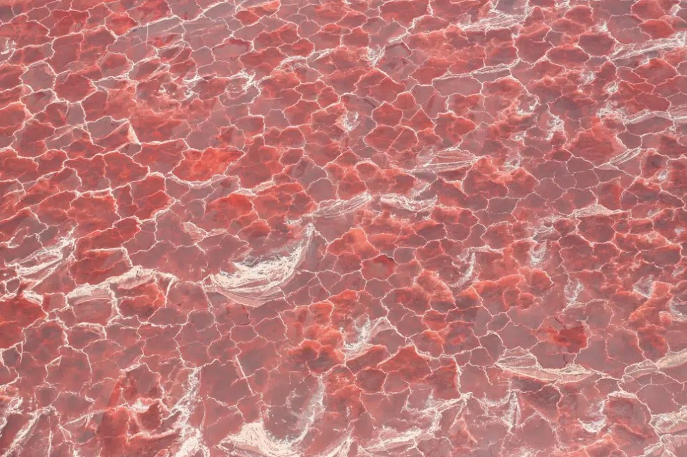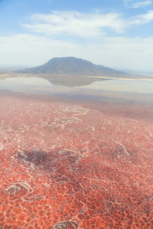 La razón por la que el agua tiene su peculiar tono de rojo se debe a las Haloarchaea, unos microorganismos que abundan en sus aguas saladas. El color rojo se incrementa al final de la estación seca cuando el nivel del agua es especialmente bajo.