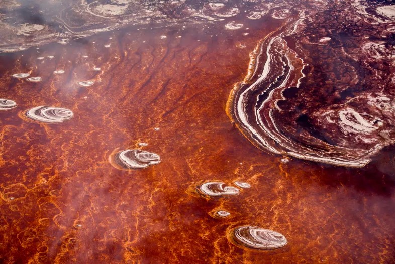 Pues se trata precisamente del agua del lago. Esta es extremadamente alcalina, con un pH de hasta 10,5 similar a la leche de magnesia, un tratamiento que se utiliza para neutralizar el ácido estomacal. Las condiciones del agua se deben a la química inusual de la geología volcánica que lo rodea. Los minerales, principalmente carbonato de sodio y sales creadas por procesos volcánicos, fluyen al lago desde las colinas circundantes. Por ejemplo el Ol Doinyo Lengai, un volcán activo que no está lejos.
