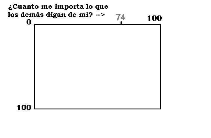 Ahora responde a esta pregunta, En una escala de 0 a 100 ¿Cuánto me importa lo que piensan los demás sobre mi? Sed sinceros. Por supuesto sabemos que no te afecta igual lo que piense alguien cercano, que alguien que ves de vez en cuando, por lo que te pedimos que te centres en un término medio. No es tu mejor amigo/a pero tampoco es alguien al que has visto 2 veces. Es decir, para que te hagas una idea de la escala: